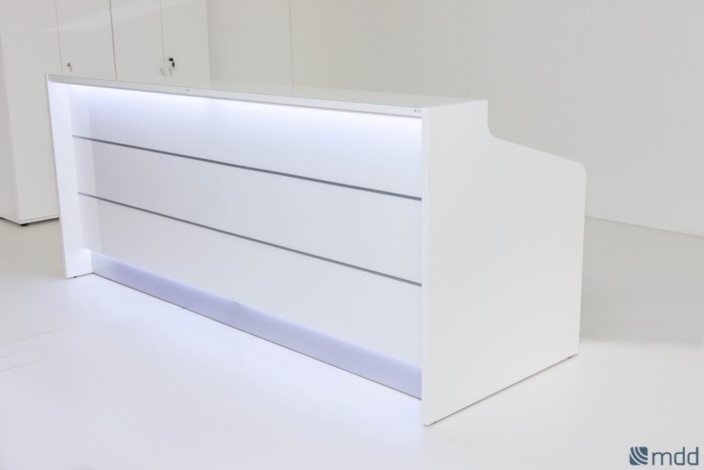 Recepčný pult je možné vyrobiť v 9 odtieňoch – white, sky blue, dark blue, avokado, grey matt, grey gloss, botle gren, trufle matt a v 6. odtieňoch drevodekoru – Honey oak, natural oak, grey oak, dark walnut, canadian oak, acacia