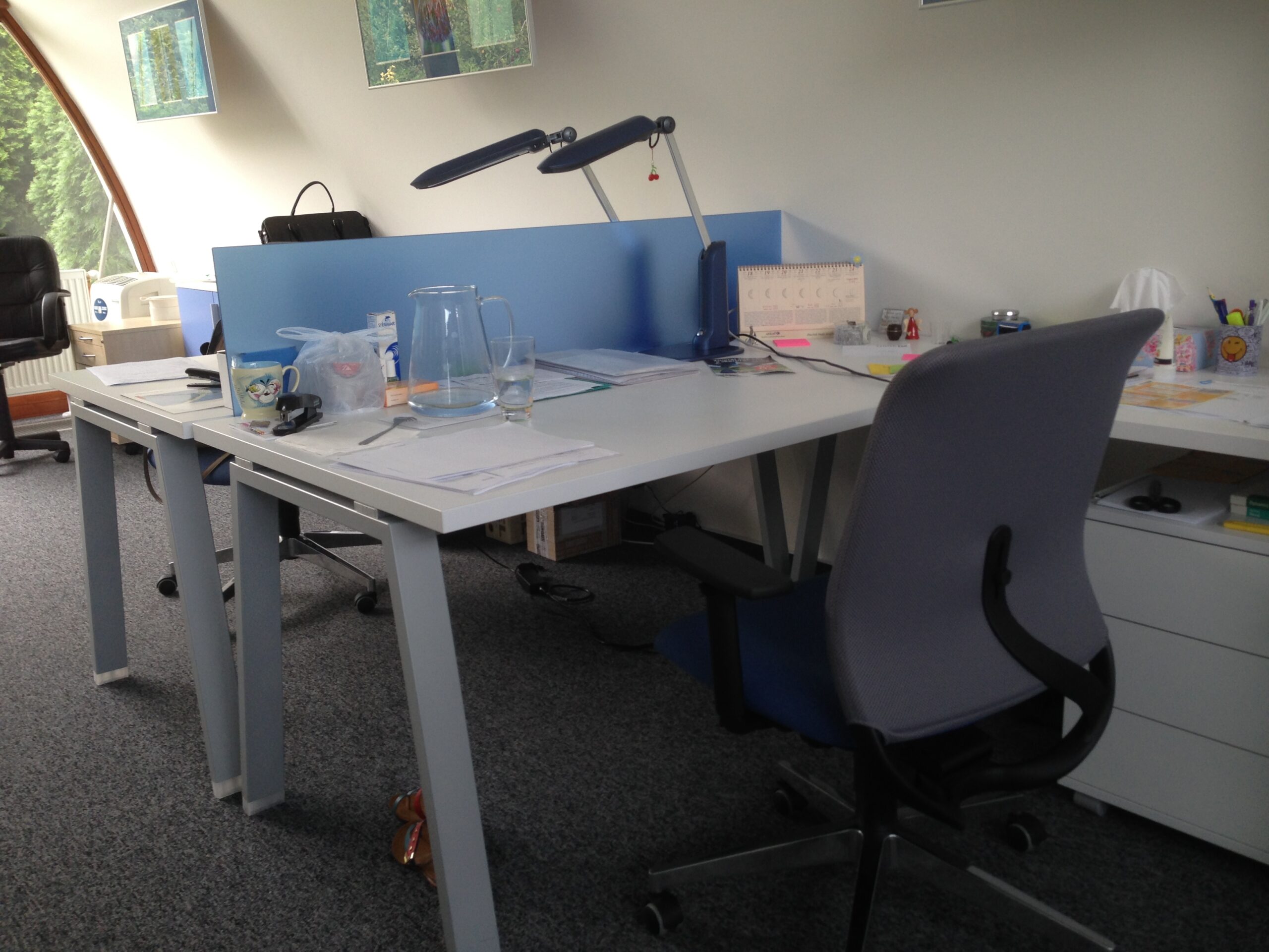 Pracovné stoly pre lekára a sestričku v bielom dekore s modrým predelom