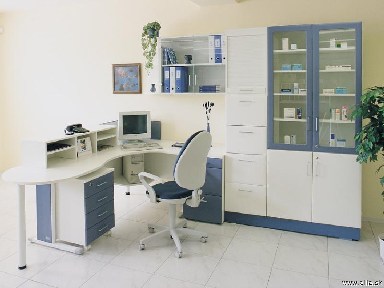 Pracovný stôl so skrinkami v bielo modrej farbe